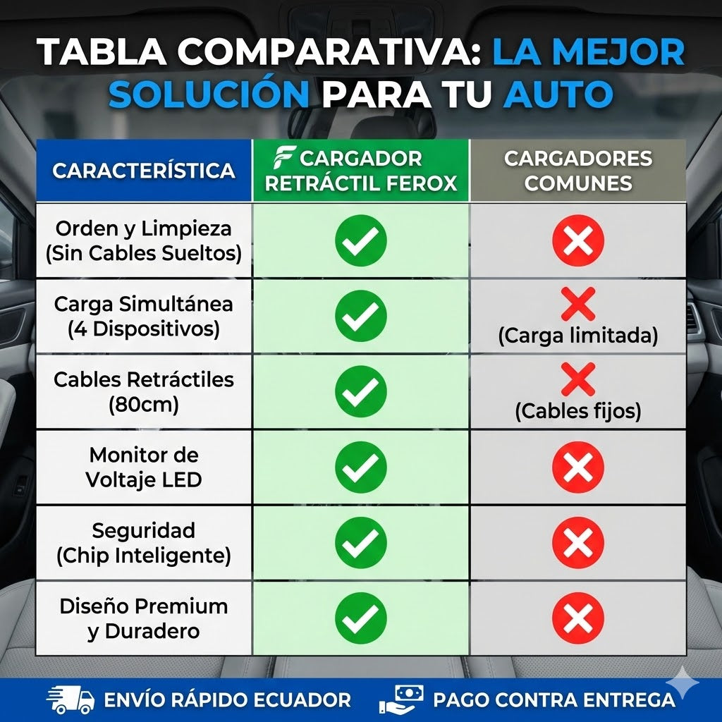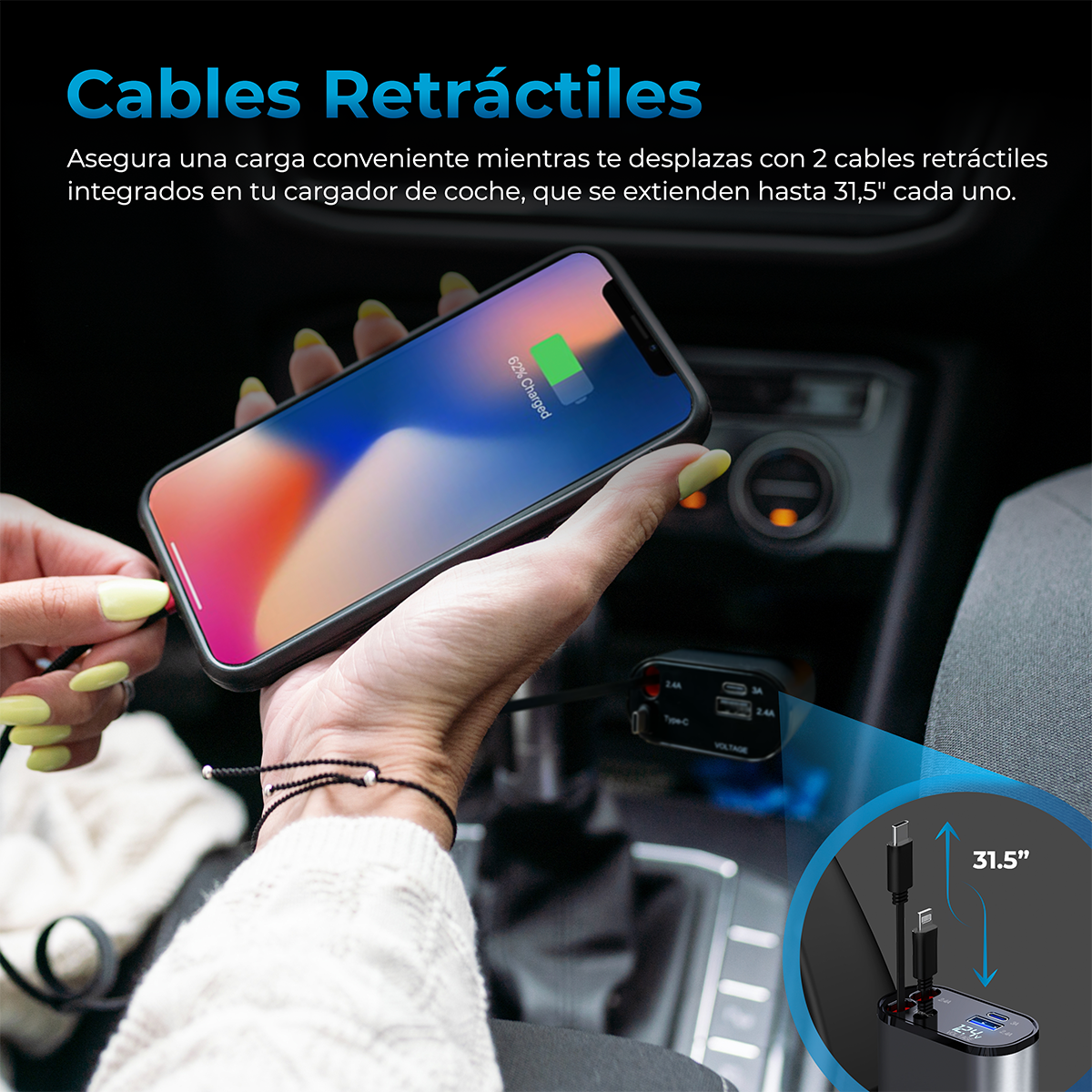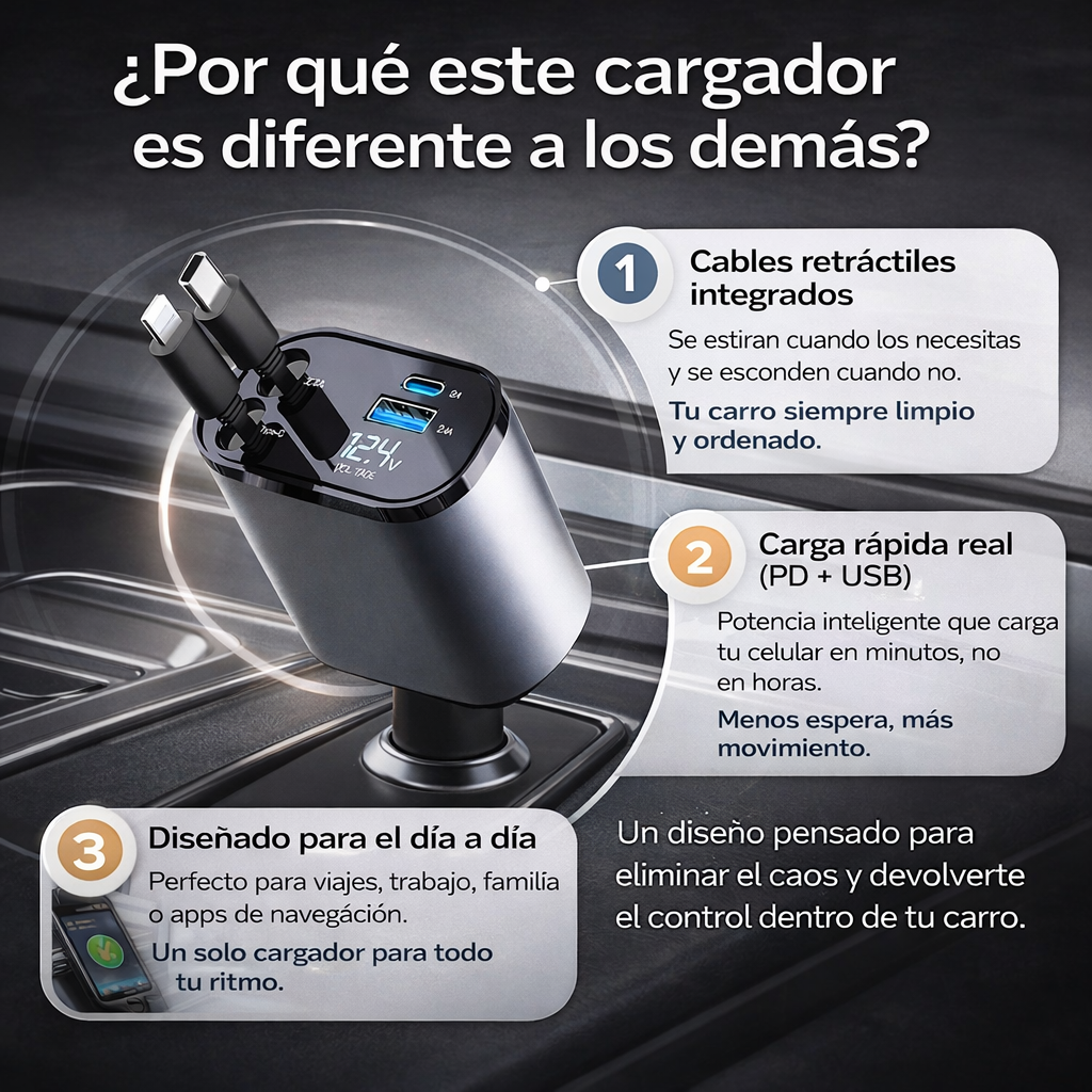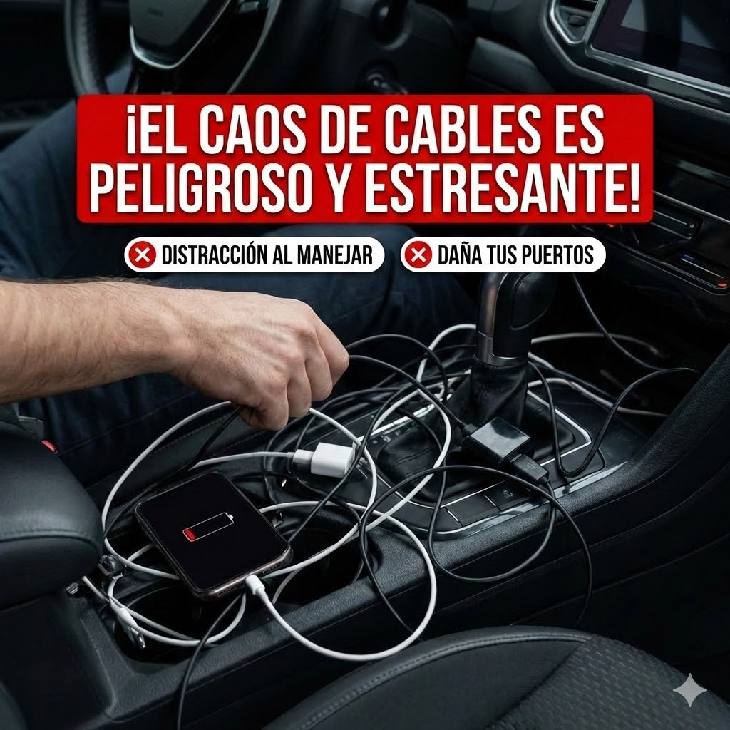 Sales de casa y tu teléfono está bajo de batería. Intentas cargarlo en el auto y… el cable no llega, se enreda o no carga rápido.
